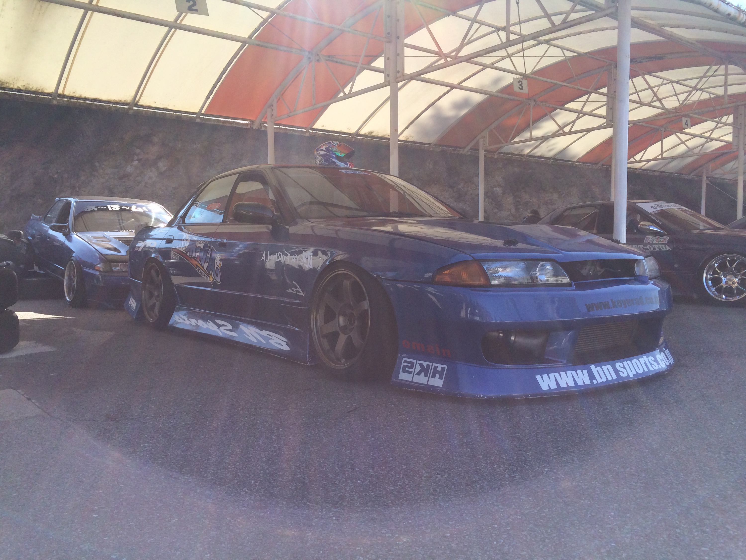 Stu Lawson’s FC3S parked up in the Driftland pits at Finalboss Matsuri. It might not be the highest specced FC in the country but it’s the only one I know of that’s fitted with Lambo doors and Zebra print door card trim (which therefore makes it the best).